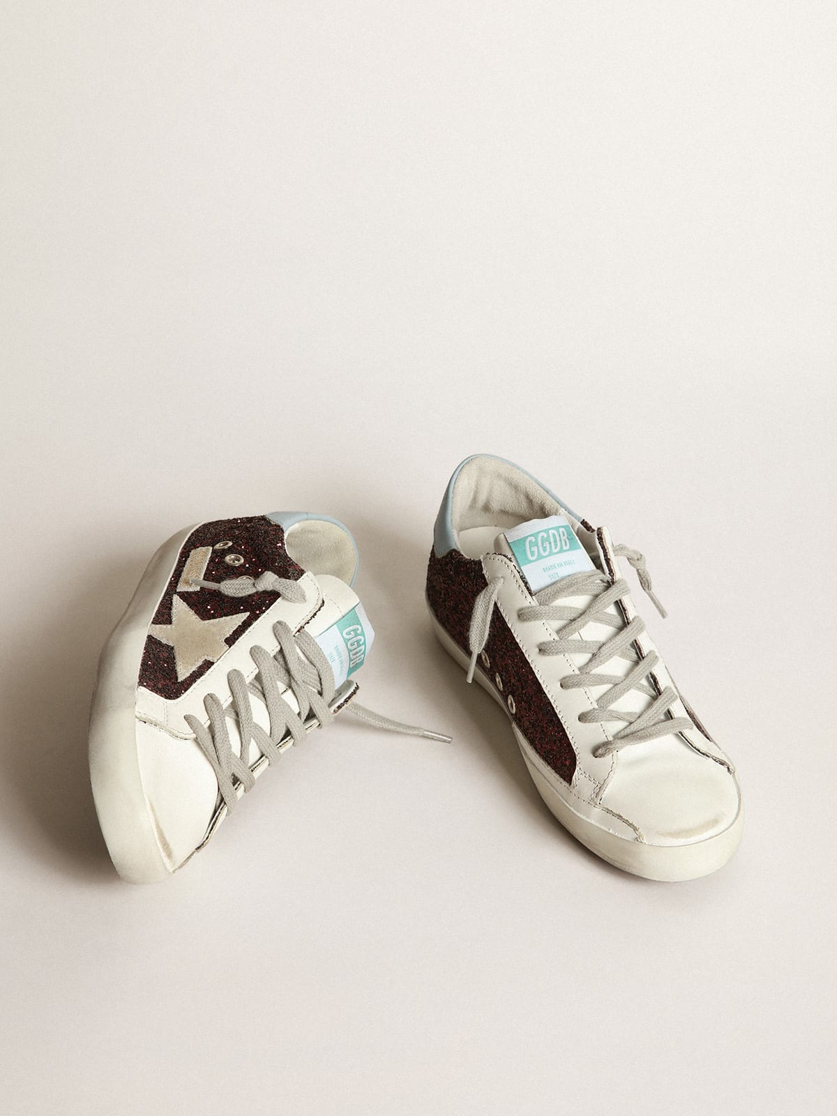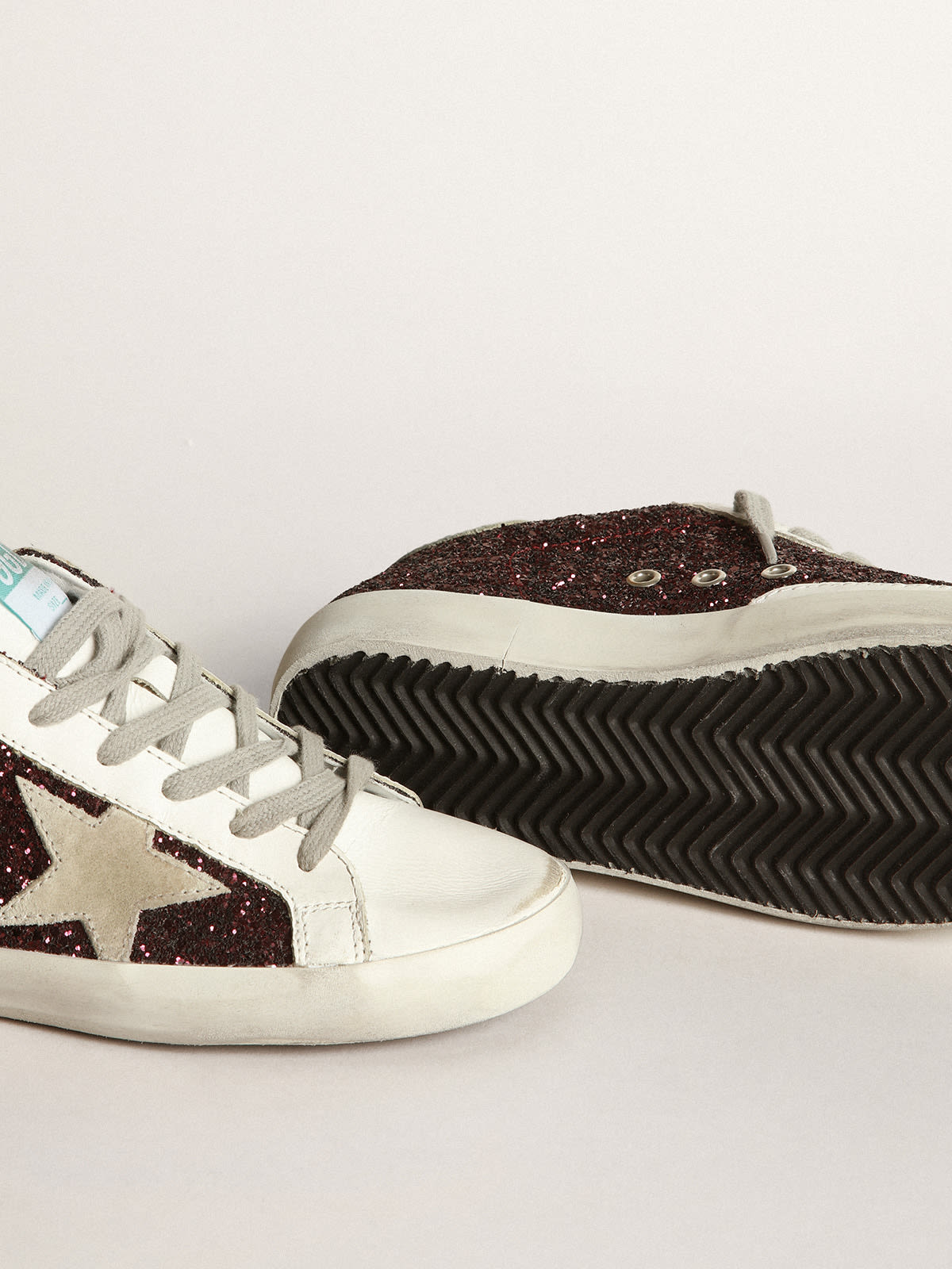 Super Star sneakers in burgundy glitter with ice gray suede star and light blue leather heel tab Very well made.