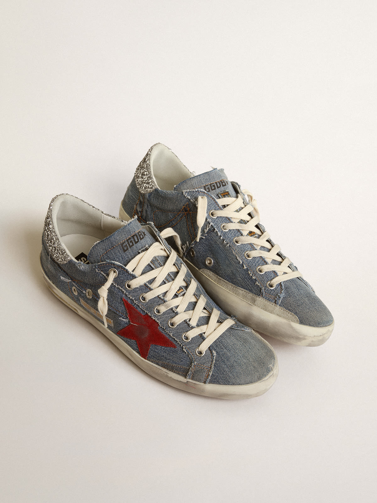 Men s Super Star LTD in denim with glitter heel tab Very well made.