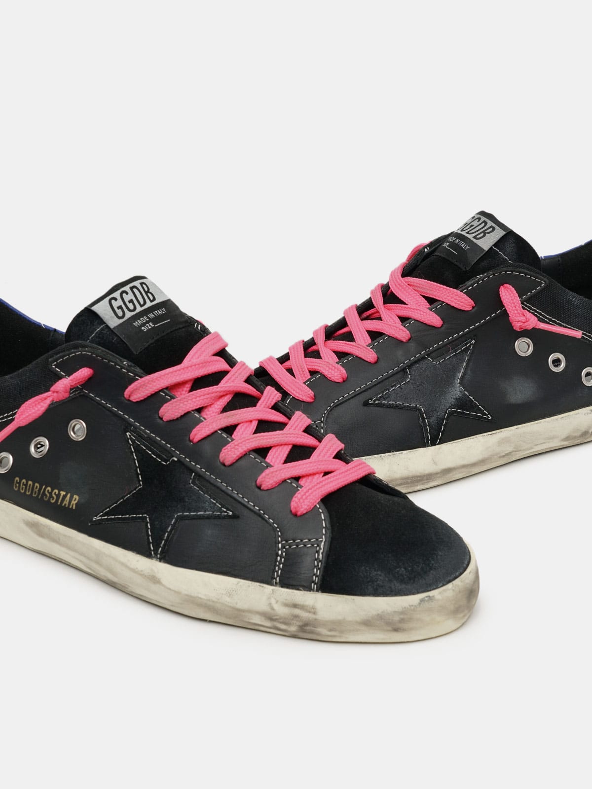 Super Star sneakers in canvas and leather with fuchsia laces and suede inserts Very well made.