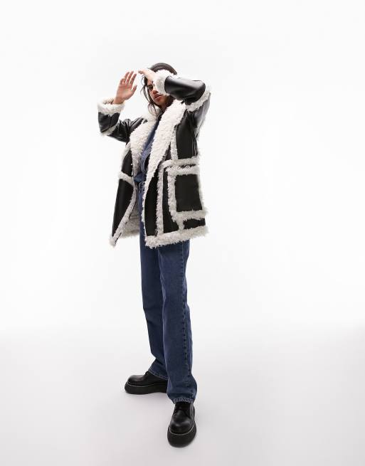 Topshop faux shearling mid length jacket with faux fur details in black Very well made.