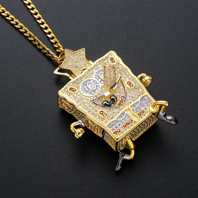 14K Gold Plated Iced Out Sponge Bob Pendant Necklace for Men Very well made.