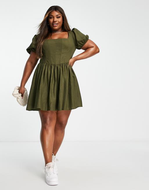 ASOS DESIGN Curve corset linen mini skater dress with puff sleeve in khaki Very well made.