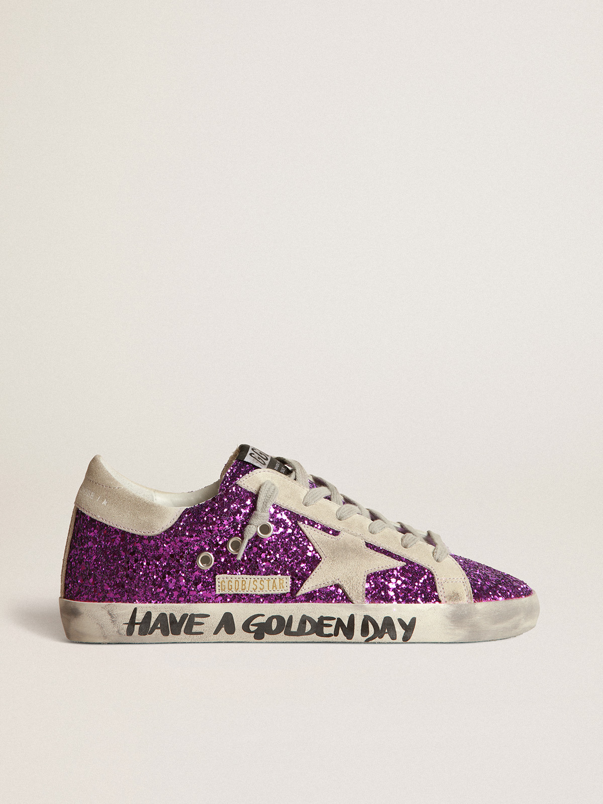 Super Star sneakers with purple glitter and lettering on the Very well made.