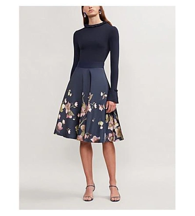 TED BAKER SEEMA Frill Neck Floral Print Dress Navy Size 2 BNWT Very well made.