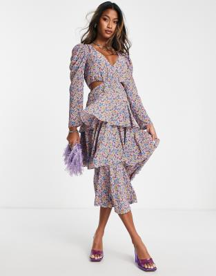 Topshop cut out side tiered ditsy midi dress in multi Very well made.
