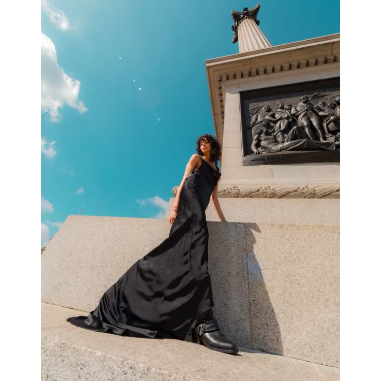 Topshop premium satin buckle detail maxi dress with train in black Very well made.