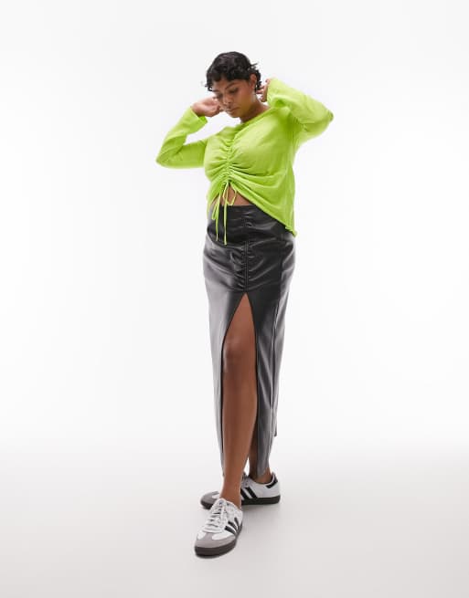 Topshop Curve leather look ruched side detail midi skirt in black Very well made.
