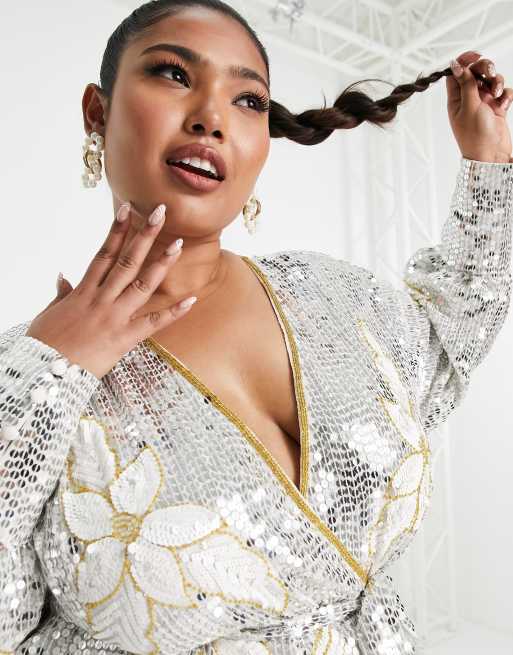 ASOS EDITION Curve floral sequin wrap mini dress in white and Very well made.