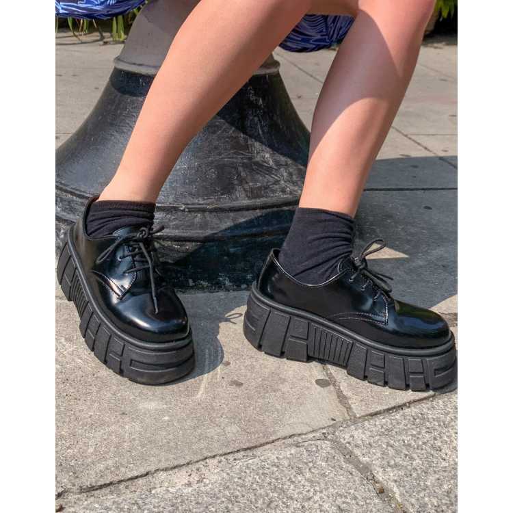 ASOS DESIGN Mandarin chunky lace up flat shoes in black ASOS Very well made.
