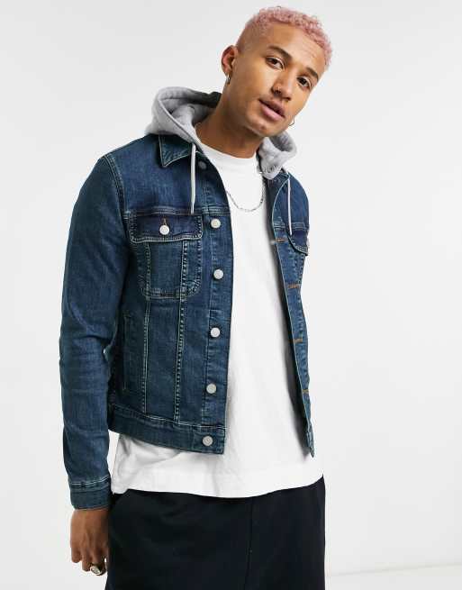 ASOS DESIGN skinny denim jacket in mid wash blue with gray hood ASOS Very well made.
