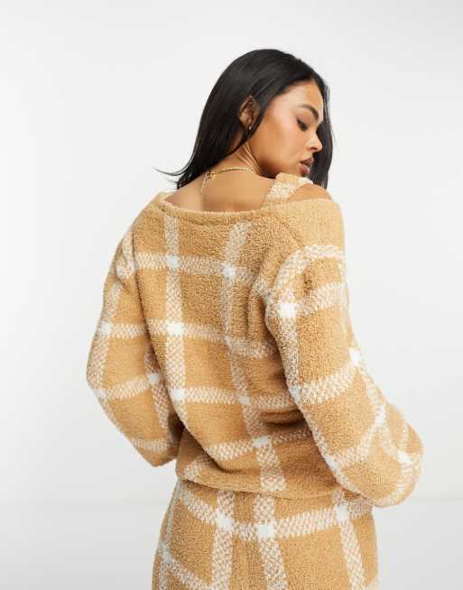 ASOS DESIGN lounge mix match check fluffy sock cardigan in camel Very well made.