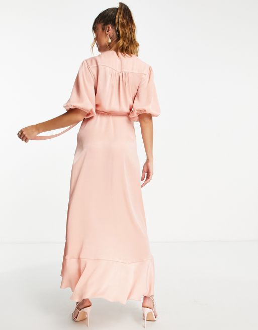 Flounce London Maternity puff sleeve maxi wrap dress in light pink satin Very well made.
