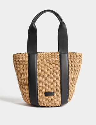 Woven Synthetic Straw Tote with Metallic Stripe Detail Green Very well made.
