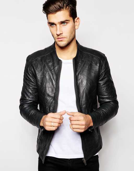 Men s Leather Biker Jacket with Quilted Ribbed Sleeves Very well made.
