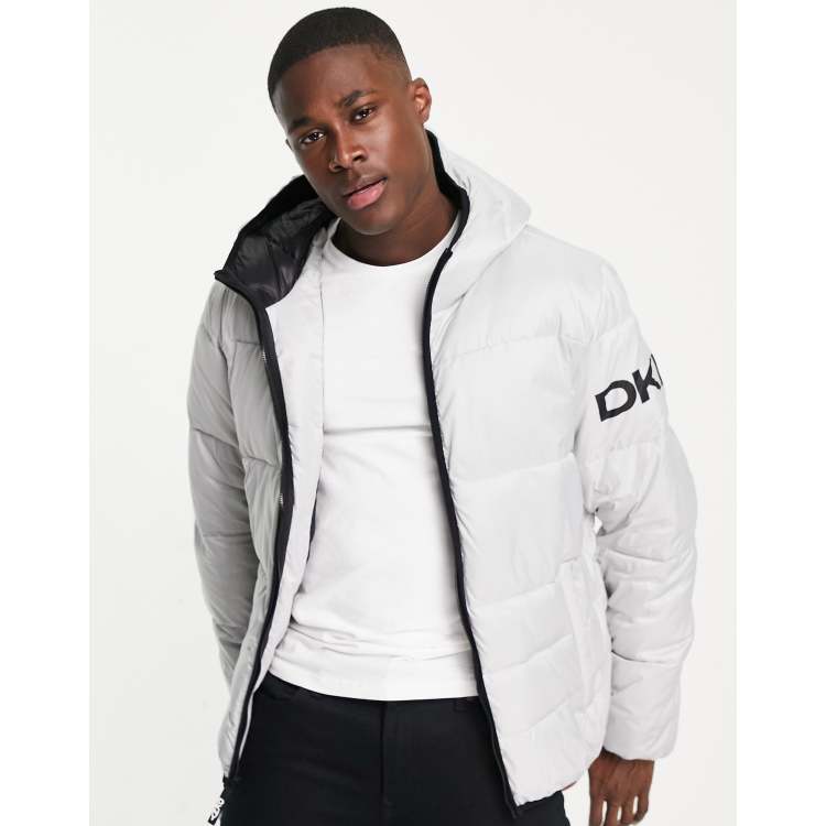 DKNY nylon hooded mid weight puffer jacket in reflective Very well made.