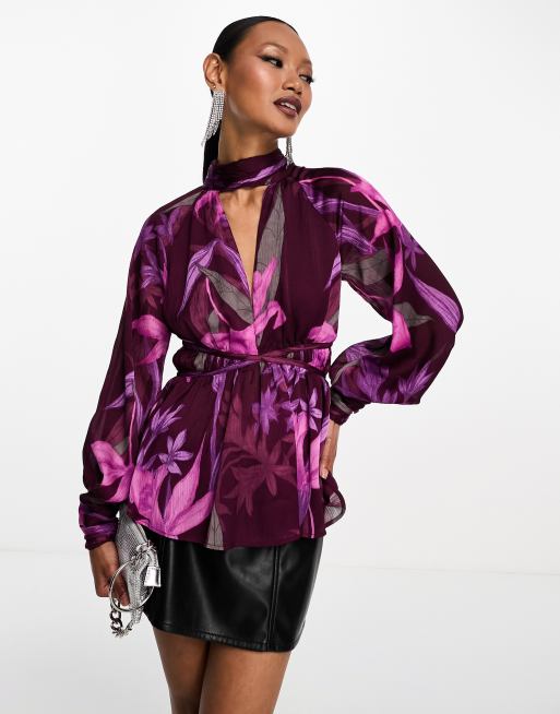 ASOS DESIGN Blusa a maniche lunghe a collo alto con orlo peplo e apertura a goccia e cut out rosa acceso e viola Very well made.