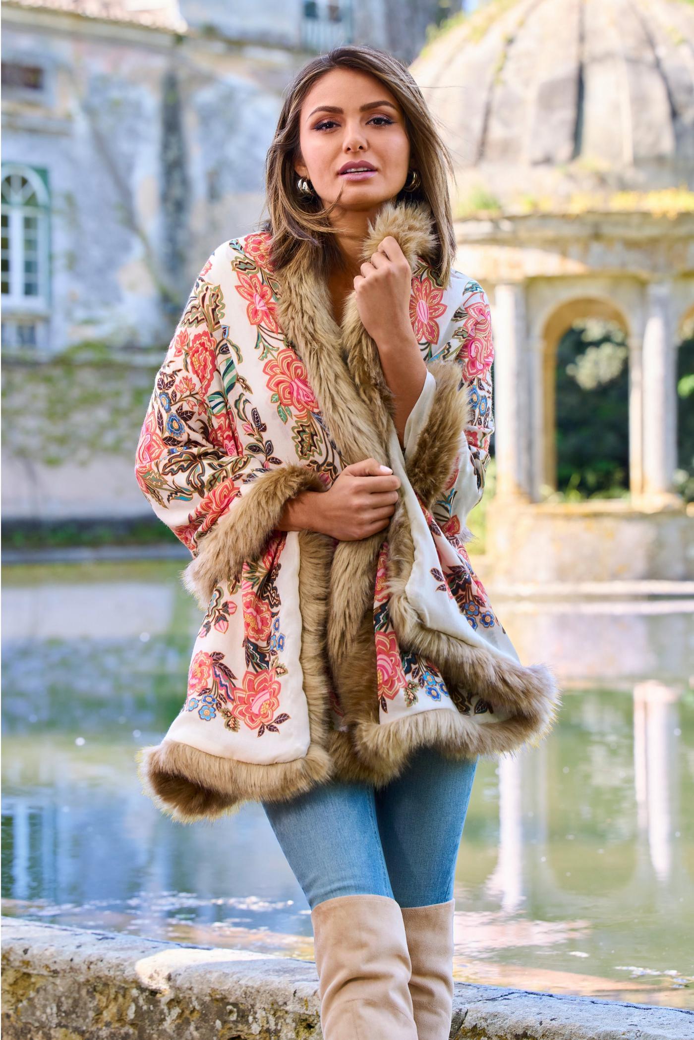 Boho Floral Print Faux Fur Trim Shawl Off White Multicolor Very well made.