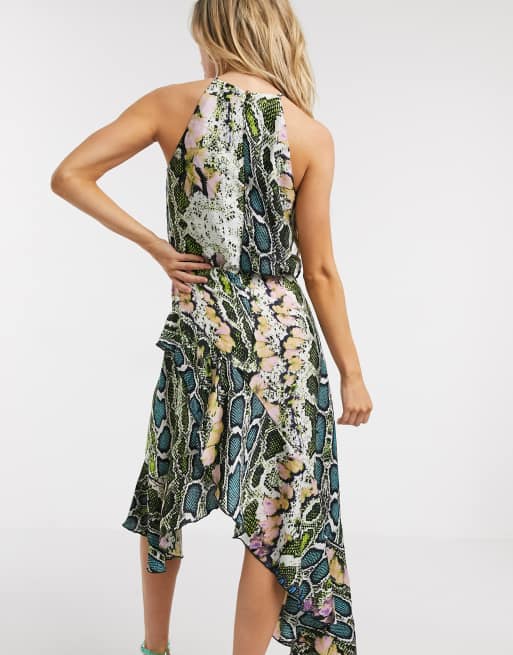 Forever U Collection halter neck wrap tie ruffle dress in multi snake print Very well made.