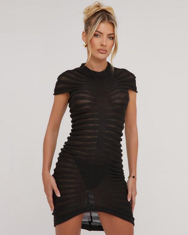 High Neck Short Sleeve Bodycon Dress In Black Textured Knit EGO Very well made.