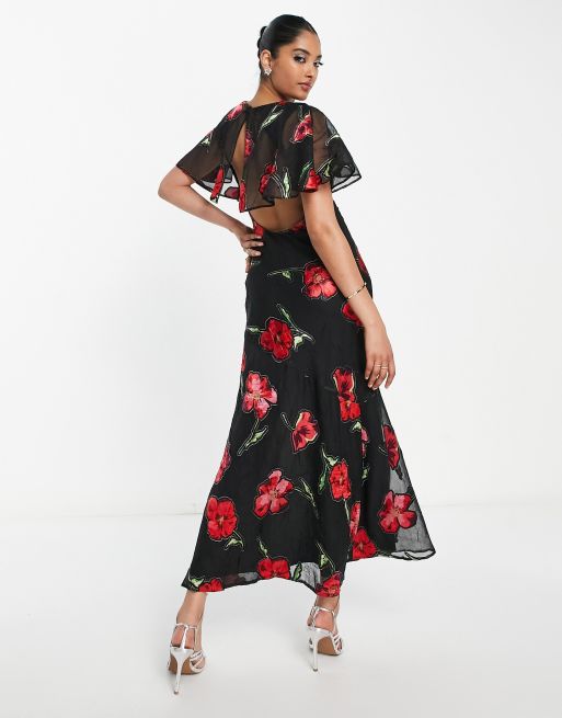 ASOS DESIGN fluted sleeve maxi dress with cut out back in jacquard rose print Very well made.