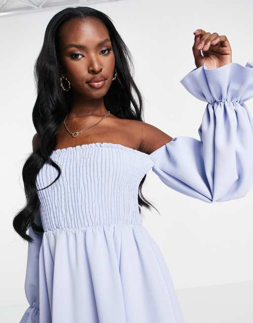 ASOS DESIGN Vestito midi per il ballo di fine anno arricciato con scollo Bardot e maniche a campana azzurro chiaro Very well made.