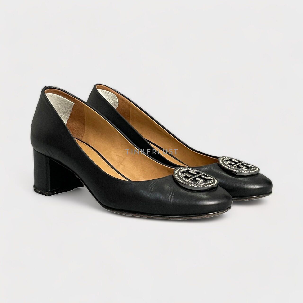 sepatu heels Tory Burch Midi Liana Embelished Black Leather Pumps Very well made.