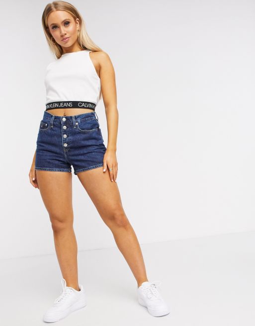 Calvin Klein high rise denim shorts with exposed buttons in dark Very well made.